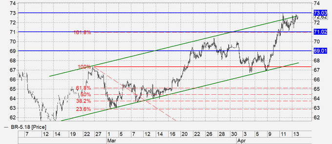Нефть: после обстрела Сирии, возможно ситуация станет менее напряженной. Утром в Азии цены на нефть незначительно снижаются, что пока не создает предпосылок для разворота вниз. Для падения цен должно появиться понимание ослабления напряженности на Ближнем Востоке. Пока его нет. Пока продолжаем смотреть вверх на отметку 76.66.