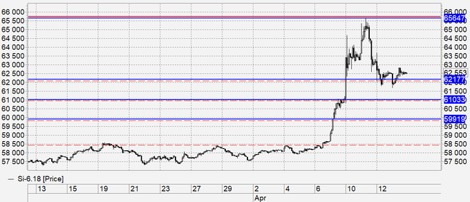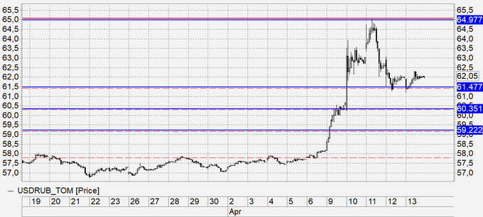 Рубль: сегодня нас ждет очередной пакет санкций со стороны США. На этот раз будут пытаться наказать компании, которые участвовали в поставках оборудования и материалов в Сирию. Слушать Россию никто не стал. Просто взяли и стерли с лица земли несколько строений в окрестностях Дамаска. С другой стороны, любая риторика об ответных санкциях со стороны тех же депутатов, приведет к еще большему ослаблению национальной валюты. При любых откатах до уровня 60.00 можно покупать. Возврат к разговорам о санкциях в отношении российских государственных долговых бумаг может привести к быстрому росту к 70.00, следите за новостями.