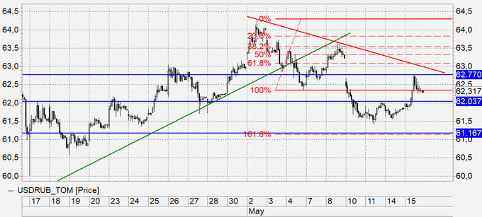 Рубль: что-то мы как-то сильно испугались падения цен на нефть. Колебания выше 60.00, хорошо, 70.00, уже никак не могут негативно влиять на рубль. Однако, нет. Могут. Да, у нас вырос импорт в первом квартале следом за ростом цен на нефть. Да, у нас вчера депутаты «демонстрировали решимость» по вводу «контрсанкций» и уже закон прошел первое чтение, хотя для введения санкций он не нужен, все в руках президента. Остановились у 62.77, но рост весьма резкий, повторяющий падение котировок нефти. Делать нечего, при подходе к 62.00 будем покупать.