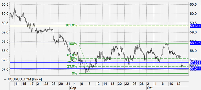 Рубль: рубль в пятницу растолкал всех быков и посетил район 57.00, после чего нехотя поднялся чуть выше. Надо признать, что под 57.00 ничего особо и нет. Поэтому сдав 57.00 бычки вспомнят о покупках только на 55.00.