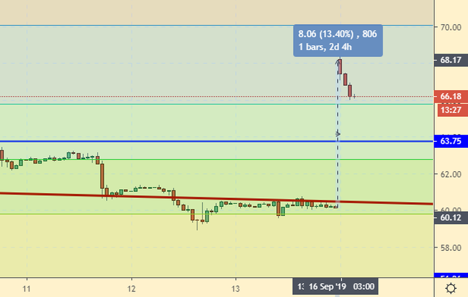 Нефть: торги в Азии начались с 13%-го гэпа на Brent. Причина? Атака дронов на завод Saudi Aramco. Видимо это пламенный привет новому министру энергетики Саудовской Аравии. Несмотря на то, что завод очень большой реакция рынка гипертрофированная. Подождем когда ущерб оценят в спокойной обстановке. В текущей ситуации откат можно использовать для покупок. Понятно, что Америка обвиняет Иран, понятно, что будет напряженность и это поддержит цены. Поэтому, пока только покупки.