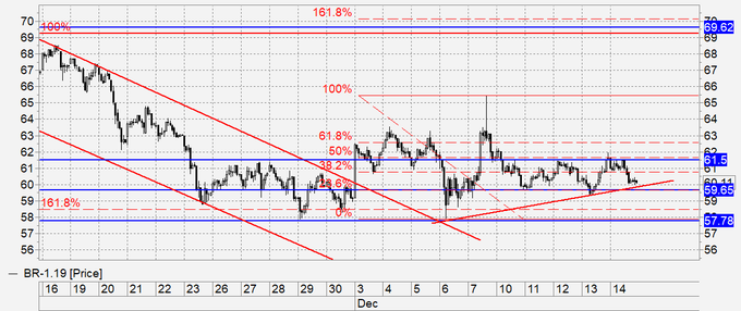 Нефть: продолжаем находиться в районе 60.00. У быков все меньше времени на то, чтобы предпринять атаку на 69.00. В противном случае, сегодня – завтра, продавцы продавят рынок, сделав Рождественской сюрприз всем поклонникам высоких цен на нефть. Отсутствие роста на протяжении двух недель будет подталкивать медведей к активным действиям. После падения под 59.30 – можно продавать. Пока мы над 60.00 можно пытаться покупать.