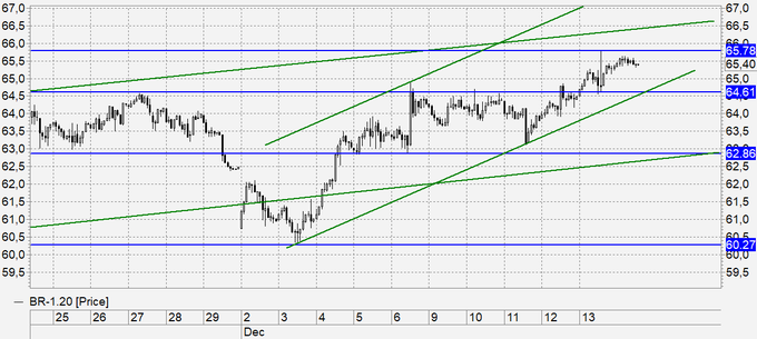 Нефть: пройти выше максимума пятницы мы не можем, тем не менее, быки продолжают контролировать ситуацию. Если сегодня мы не увидим новый локальный максимум у медведей появится повод атаковать. В случае падения цен ниже 64.50 можно подключиться к падению в расчете на то, что рынку нефти так и не удастся закончить год на оптимистичной ноте. В текущей ситуации, когда глобальных фундаментальных данных нет, отчеты по запасам от API и EIA будут иметь большой вес.