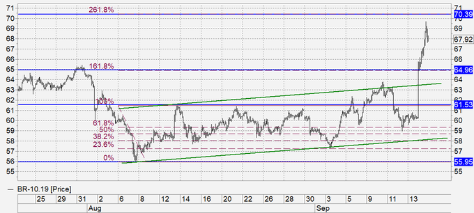 Нефть: рынок практически выполнил техническую цель на 70.00. Только после этого быки взяли паузу. Теперь цены смогут забраться еще выше если будет второй налет на нефтеперерабатывающий завод в Саудовской Аравии. Вызывает удивление точность атаки диких нищих партизан в руки которых как-то попало столь высокотехнологичное оружие, с которым они блестяще справились. Все прилетело туда куда надо. Через неделю станет ясно насколько на том заводе все серьезно. Пока следим за ситуацией. Выше 70.50 сегодня рынок вряд ли поднимется.