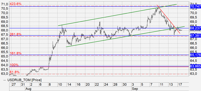 Рубль: переходим на декабрьский контракт дата экспирации 20 декабря, биржа ММВБ. Медведи по доллару могут занести вчерашний день себе в актив несмотря на то, что мы никуда и не упали в итоге. Рынок продолжает оставаться под давлением, бычья атака на 68.50 была отбита. Угроза хода на 65.20 продолжает сохраняться.
