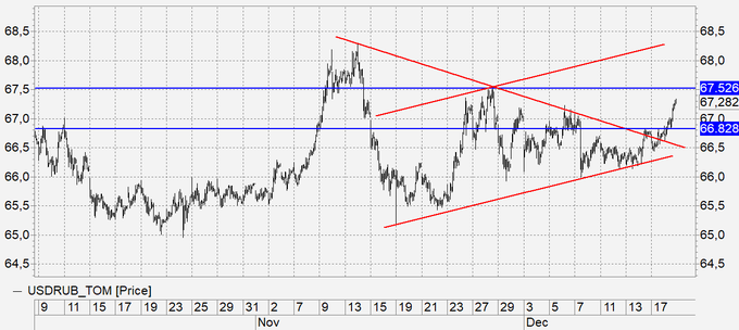 Рубль: ничего нового, нефть вниз, доллар вверх. Если нефть будет на 50, а рубль по 80, то и бюджет будет сбалансирован, и зарплату-то мы получаем в рублевой зоне, и не надо волноваться. Все прекрасно. По технике нас ждет сегодня проход выше 67.50. К Новому Году можем быть аккуратно на 69.99. Следующий год, то 19-й, во всем должна быть красота. А в цифрах она абсолютная. Сегодня поддержать рубль может только решение ФРС не повышать ставку, но шансов на это процентов 20, не больше.