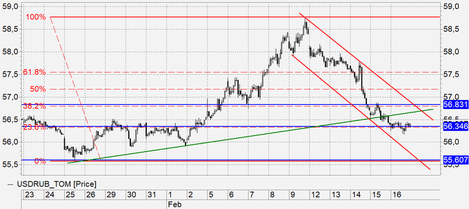 Рубль: если покупать доллар, то только после роста выше 56.80. Пятница прошла спокойно. Вроде нащупали какую-то поддержку в районе 56.20, но с принятием решений о покупке пока не торопимся. А вдруг кому-то надо продать доллары именно сегодня? Если мы подойдем к 56.80, то там и продавайте. На этом уровне явно будет борьба, и чем она закончится, признаться, не ясно.