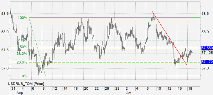 Рубль: сам по себе рубль укрепиться не сможет, нужен рост нефтяных котировок, но и слабеть в текущей ситуации у него причин нет. Таким образом, если нефть не рухнет, рубль будет парить над 57.00.