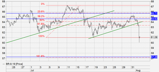 Нефть: рынок уже был слаб после понижения ставки ФРС, а вчерашний твитт Трампа дал дополнительный толчок, после чего рынок упал на пару долларов. Сложности в переговорах с Китаем и перспективы ввода 10%-ой пошлины на товары объемом 300 млрд. долларов сами по себе может быть и не так страшны, но если данный шаг будет сделан, то перспектив на глобальное развитие в ближайшие несколько лет станет меньше. Нефть продолжит движение к 57.30. Остаемся в шортах.