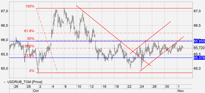 Рубль: продолжаются затяжные маневры под 66.00. Не смотря на продолжающееся падение цен на рынке нефти рубль остается ниже важного технического уровня 66.00 (рынок сам сделал его важным несколько раз оттолкнувшись от него). Ситуация для рубля остается сдержанно-оптимистичной. Текущее снижение нефтяных котировок на катастрофу не похоже, а с санкциями не слишком-то все и понятно. Пока продолжаем утверждать, что сигналом к укреплению рубля будет пробой уровня 65.35. Пока этого не произошло смотрим вверх.