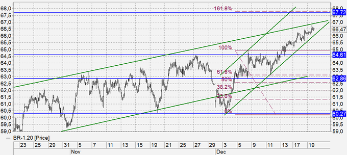 Нефть: рынок пытается добраться до цели на 67.70. Если это получится, то можно будет говорить о том, что претензии на продолжение роста в начале следующего года сохраняться и возможно мы увидим еще как минимум два раунда борьбы над 60.00 за то, чтобы задрать рынок как можно выше. Если же цены так и не подойдут к цели (остается пройти, по сути, 1 доллар), то тогда быкам в будущем будет непросто убедить толпу в своей состоятельности. Держим лонги.