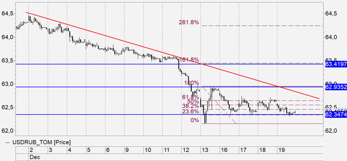 Рубль: быки по рублю наседают на уровень 62.30, пытаясь закончить год сверхоптимистично. Стоит признать, что в случае хода ниже 62.30 уровень 60.70 становится абсолютно досягаемым. А вот ниже него рынок пока не просматривается. Но пока мы стоим выше 62.30, шансы на рост доллара сохраняются. Вчера было выступление президента, а на фоне выступления не гоже позволять национальной валюте слабеть. Этот момент тоже не стоит сбрасывать со счетов, объясняя вчерашнее укрепление рубля.