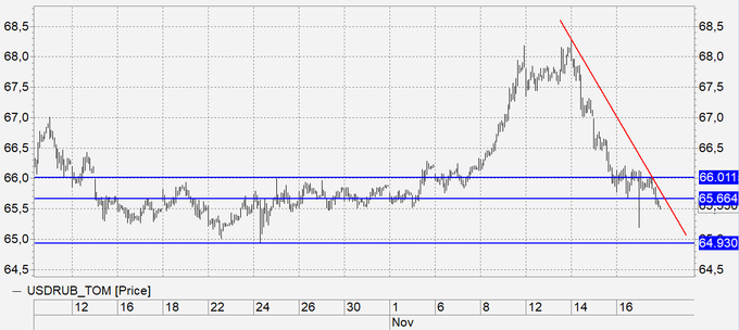 Рубль: быков по доллару продолжают с азартом выносить с рынка. 65.00 видится как некое препятствие, но оно долго не простоит. Жаль, столь резкие изменения не позволили корректно подключиться к данному падению. На случай если обвал продолжится можно продать сейчас со стоп-ордером на 65.70. Рекомендовать такую продажу морально тяжело, так-как нет ничего хуже, чем гоняться за рынком. О покупках пока не помышляем.