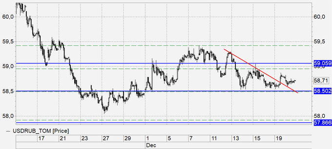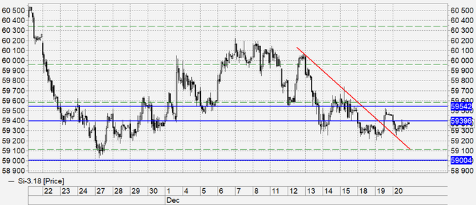 Продажа: после пробоя вниз 58900 при поддержке нефти. Стоп: 59200. Цель: 55000.