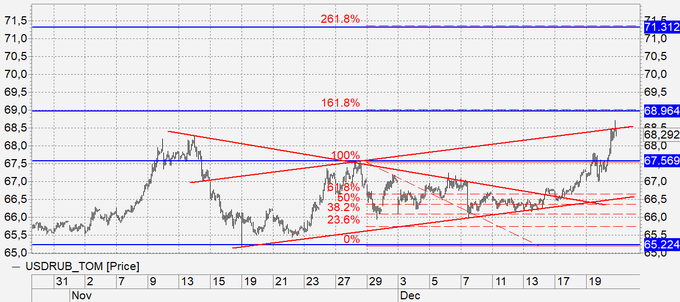 Рубль: если вчера утром еще были какие-то сомнения в том, что рубль как-то способен сопротивляться, то сегодня просто нет ничего, что мешало бы ему падать и дальше. Мы дойдем сегодня до 69.00, далее кофе-брейк, а затем, не исключено, что аккуратно к Новому Году рынок будет пытаться пройти и к 71.30. От нефти ждать помощи не приходится. Поэтому, в начале 69.00, откат к 68.00, далее 71.30 и Новый Год.