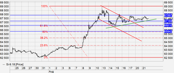 Рубль: вечером сегодня ждем официального объявления вступления в силу новых санкций США против РФ. В принципе, если нефть возьмет 73.20 и пойдет вверх, то данные санкции не повлияют на ситуацию, и мы сходим к 65.00 (64.00). ЦБ вновь скупает валюту не смотря на высокий курс доллара, что вызывает некоторое недоумение. Различные «бюджетные правила» иногда нужно уметь задвигать под ковер. А так, сохраняется риск, что мы будем падать даже при растущей нефти и профицитном бюджете. Происходящее не совсем понятно. Если коррекция отработает как надо (мы упадем к 65.00) – купите.