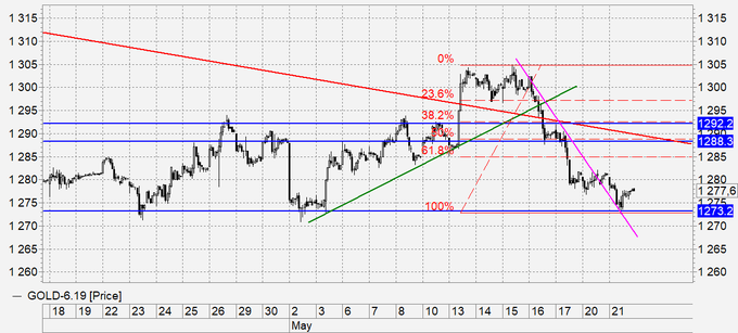 Золото: стоит признать, что несколько ошиблись с целями первоначального движения по Фибо уровням. Оказывается, надо было ударить в 1273 и после этого разворачиваться вверх. Хорошо. Упали мы слишком сильно для того, чтобы сейчас поверить в разворот рынка вверх. Пока только продажи. Подъем к 1288 использовать для шорта обязательно.