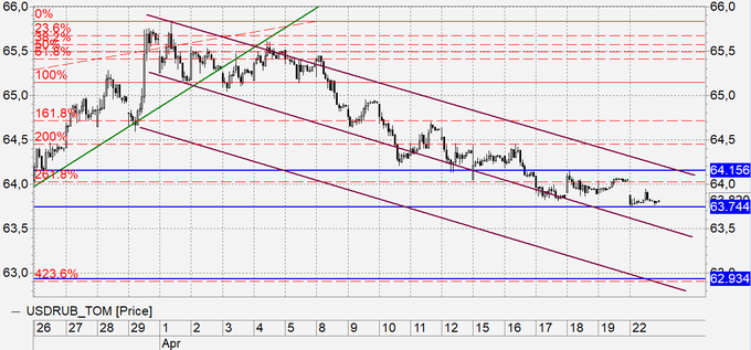 Рубль: рубль было отправился на 63.00 как это и планировалось. Но прыти мы так и не увидели. Видимо начинающиеся через неделю достаточно затяжные праздники располагают к тому, чтобы не оставаться в рубле. Иных предпосылок, новые возможные санкции не учитываем, для того чтобы остановить свое укрепление у рубля пока нет. 26 апреля заседание ЦБ РФ. Возможно будет рассматриваться вопрос по ставке. Если она снижена не будет, рубль продолжит укрепляться.