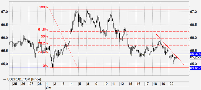 Рубль: вчера вечером мы видели редкое явление, затмение разума. Нефть падала, рубль рос. Ну, что же, сегодня или последует расплата за дерзость, и рубль упадет, или мы пойдем к 64.00. Налоговый период (крайняя дата по квартальным платежам 25 октября) подходит к концу, тем не менее, еще пара дней есть и к 64.00 мы успеем сходить, а вот ниже, ниже это уже совсем другая история. Там 60.00, а для того, чтобы окрепнуть до столь почетной отметки надо бы быть уверенным, что ничего ужасного в ноябре с санкциями не произойдет.