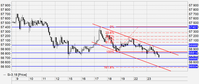Продажа: на мелких интервалах на фоне укрепления нефти можно продавать. К сожалению, текущие уровни тактически не выгодны для продажи на часовых интервалах. Кто в позиции, держите стоп на 56900. Первоначальная цель возможного падения 56500.