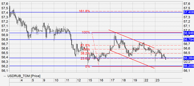 Продажа: возможна, если рынок откроется ниже 56.35. Стоп: 56.65. Цель: 56.00.