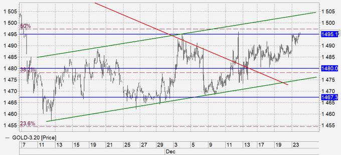 Золото: вряд ли накануне католического Рождества мы увидим резкие движения. Тем не менее, определенный рост, рост к 1495, уже на лицо. Пока мы не прошли 1505 и не выросли выше верхней границы пологого восходящего канала у медведей будут шансы на разворот рынка вниз. Основная идея — это ослабление доллара, но кроме неё, это покупка золота государствами такими как Малайзия, Турция и Иран, которые стремятся проводить независимую от Вашингтона политику.