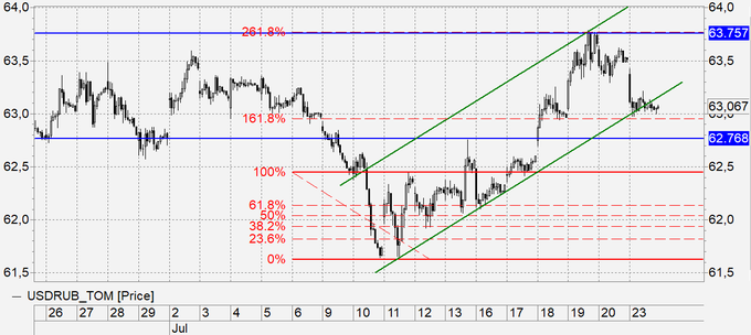 Рубль: вчерашний откат от 63.75 до 63.00 оказался приятным сюрпризом для тех, кто хочет купить доллары подешевле. Угроза для быков по доллару только одна, и это не нефть, а сам доллар. Если первого августа повышения ставки не будет, тогда можем и к 60.00 сходить. При условии, что нефть передумает падать.