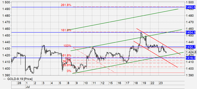 Золото: на фоне ожидания решения по ставке ФРС 31-го июля идет вязкая борьба в диапазоне. Рынок потихоньку приседает. Если выбило вчера из покупки есть два варианта. Или ждем роста выше 1433, или покупаем сейчас и добавляем на подходе к 1420. Понятно, что второй вариант агрессивнее. Продажи предлагаем рассматривать после падения рынка ниже 1415.