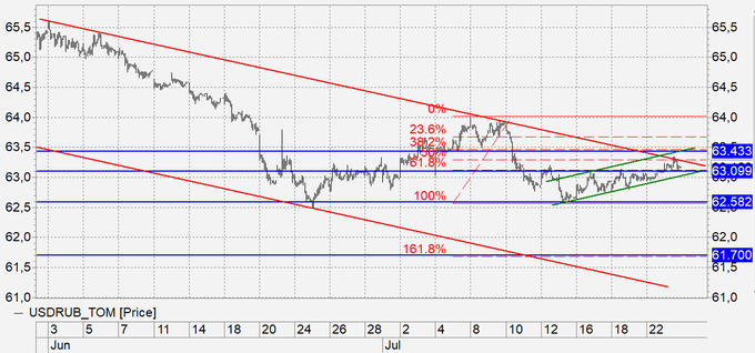 Рубль: пара продолжает вырисовывать коррекционную формацию, не проявляя какой-либо агрессии. Текущий рост котировок на рынке нефти не дает рублю пасть. В пятницу у нас заседание ЦБ РФ. Не факт, что в случае снижения ставки на 0,25% рубль упадет. Объективно, в случае роста выше 63.50 можно будет рассмотреть покупки доллара против рубля.