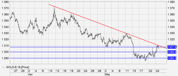 Золото: драгоценный металл во всей красе. Тот, кто считает, что золото теперь это, мол, больше технический металл, такой же как палладий, например, посмотрите на вчерашнюю реакцию рынка на отмену встречи между Трампом и Ким Чен Ыном. Ничего подобного. Рост выше 1310 вернет быков на рынок, это надо учитывать.