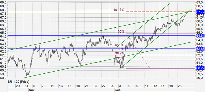 Нефть: католическое Рождество. На Западных площадках выходной день. Вчера закончили на максимальных отметках, немного не дотянув до обозначенной нами цели на 67.70. Уже можно сказать, что аналитики в начале года ошиблись, американцам так и не удалось приблизится по показателям добычи нефти к 15 млн. баррелей в день. С другой стороны, зачем наращивать, когда можно просто поддерживать баланс, не давая цене падать ниже 60.00 долларов за бочку. Нефть еще пару десятков лет будет очень ценным ресурсом, и если рассуждать на перспективу, то увеличивать добычу имеет смысл при приближении цен к отметке 100.0. Потребители могут платить, это показала практика 2011 – 2104 годов.