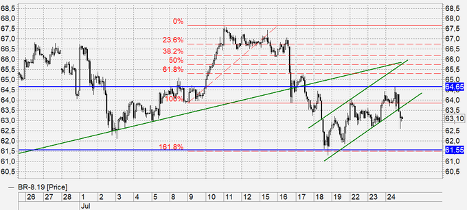 Нефть: EIA подтвердило полученные ранее данные от API по снижению коммерческих запасов нефти в США. Падение составило 10.835 млн. баррелей. Тем не менее, данные цифры не стали неожиданностью так как подобное снижение носит сезонный характер и повторяется всякий раз в середине лета. Ничего неожиданного. Рынок не смог пробиться к 65.00 и, судя по всему, взял курс на 61.50 с целью пробить данный уровень и уйти к 60.00.