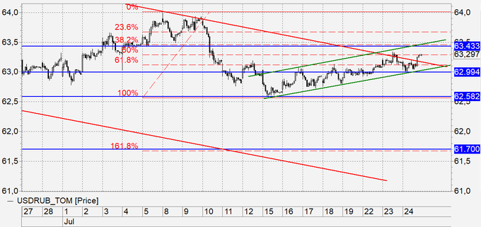 Рубль: высунулись из падающего канала и посмотрели вверх. Пока движения носят осторожный характер. Уровень 63.50 продолжает оставаться сильным сопротивлением. Завтра заседание ЦБ РФ. Пишут о пересмотре ставки, но этого может и не быть. Пока рынок ведет себя так, что ему нужен лишь повод для того, чтобы продолжить падение. Только падение цен на нефть может помешать укреплению национальной валюты.