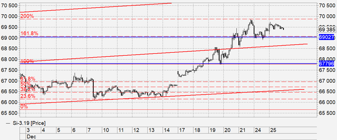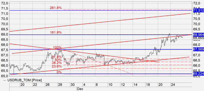 Рубль: продолжаем ждать от рубля, что он в последние дни замедлит падение и как минимум нарисует нам коррекционную формацию, окрепнув на два процента. На самом деле, следующий год для доллара простым не будет, поэтому еще не факт, что рубль будет выше 70.00 в 2019-м. Опираясь на технику, можем сказать, что сегодня краткосрочные продажи доллара возможны.