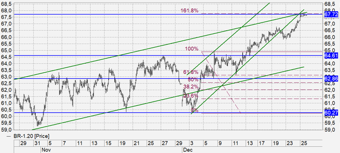 Нефть: российская площадка позволила вчера всем, кто следит за нашими прогнозами, зафиксировать прибыль на 67.70, и более того, продать от данного уровня в расчете на то, что мы скорректируемся после западных праздников. Перспектива дальнейшего роста без отката к 65.20 выглядит крайне сомнительно. Отметим, что желающие, кто стоит в лонгах, могли не закрывать часть позиции, или всю позицию, и подтянуть стоп ордера для того, чтобы посмотреть, что же будет дальше.