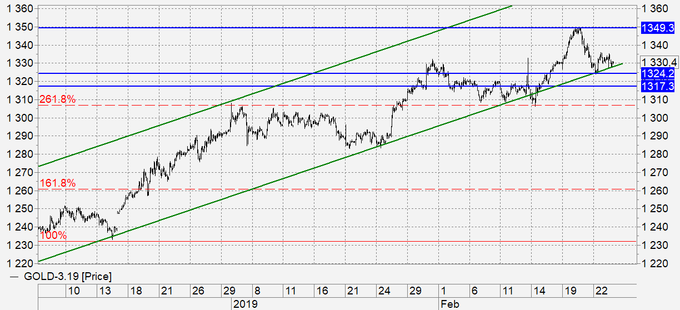 Золото: сегодня день «ч». Уйдем ниже 1325 – отправимся на 1290. Удержимся в ценовом канале – пойдем на 1380. Индекс доллара пока склонен к падению. Давление на американскую валюту сохранится вплоть до мартовского заседания ФРС (20 марта). Ставка скорее всего будет сохранена на прежнем уровне, но интересны будут комментарии.