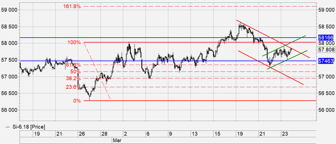 Продажа: идеально при касании 57.45. Стоп: 57.55. Цель: 55.00.