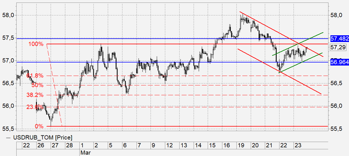 Рубль: вопрос в том, кто сегодня победит, экономика или политика. Пока рынок находится под 57.40 будем считать, что высокие цены на нефть поддерживают рубль и политические кризисы нам не страшны. В противном случае, влияние раздутого скандала об отравлении агента, который может закончится высылкой дипломатов сразу из нескольких стран, окажет влияние на настроения держателей российских облигаций и рубль несколько ослабнет.