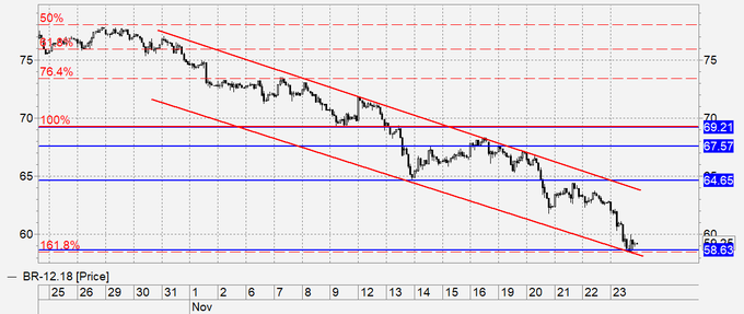 Нефть: после падения в пятницу сегодня ждем отскока от минимумов. Анонсированная нами отметка 59.00 практически достигнута. Теперь можно и восстановиться до 65.00. Но будьте внимательны. Восстановление это долгим не будет. Рынок нефти останется под давлением. Как-то может подправить дело совет экспортеров в Вене 6 декабря. Но не факт, что там удастся договориться. И если не удастся, то Brent пойдет на 50.00. А пока покупаем.