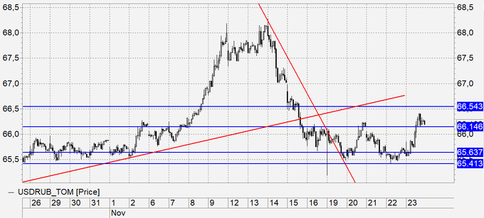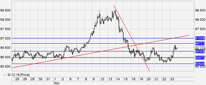 Рубль: сегодня мы подойдем к 67.00, а вот подняться выше нам вряд ли суждено. Только при продолжении падения цен на нефть мы пойдем к 70.00, но на нефтяном рынке назрела коррекция, поэтому сильного падения рубля не ждем. Пока ситуация воспринимается равновесно. От 67.00 можно пытаться продавать. Надо послеживать за Украиной. В Керченском проливе начались морские бои местного значения. Как будет развиваться ситуация пока не ясно.