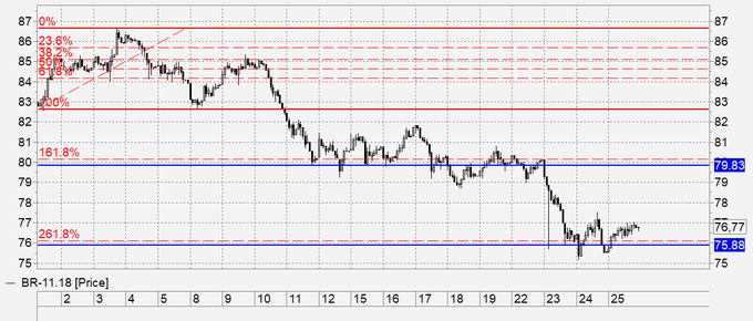 Нефть: рынок стабилизировался в районе 76.00. Сегодня не исключен сценарий, когда будет фиксироваться прибыль перед выходными и рынок несколько вырастет. Мы ставим ориентир 80.00, выше этого уровня котировки в рамках падающей тенденции восстанавливаться не должны. Вечером будет отчет о буровых установках в США. Рынок может потрясти в момент выхода данных. Шансы на продолжение падения есть. Поэтому, если прирост буровых будет в районе +10, то котировки продолжат снижение. Внизу нас ждет 70.00.