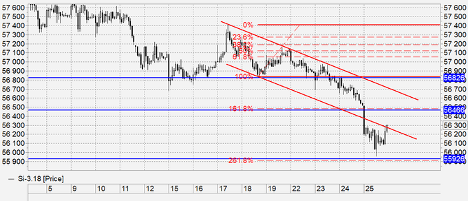 Продажа: при касании 56600, при условии, что нефть не будет падать. Стоп: 56900. Цель: 55100.