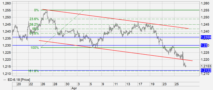 Евро: Марио Драги не сказал ничего интересного. Евро технически отвалилось к 1.2150, где и осталось вчера. Сегодня торги европейской валютой в Азии проходят слабо, курс практически не меняется. Возможно, что мы увидим проход к 1.2110 на европейской сессии после чего последует незначительный рост евро перед выходными. 2 мая заседание ФРС США, а у нас выходной. Пока аналитики склоняются к тому, что ставка повышена не будет, но перевес незначительный. Без доступа к торгам сюрпризов бы не хотелось. Лучшим вариантом в данной ситуации будет закрыть все позиции и спокойно отдохнуть.