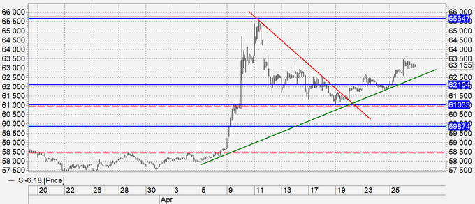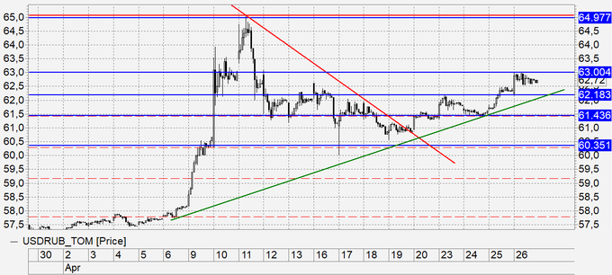 Рубль: пока признаков жизни не наблюдается. Мы протестировали 63.00 и пока остались под данным уровнем, но скорее всего перед праздниками спрос на доллары увеличится. Поэтому, каких-либо коррекционных движений сегодня не ждем. Перепроданным сейчас рубль не выглядит, «технического» давления на доллар нет.  Плюс к тому, заседание ФРС США 2-го мая, где могут быть сюрпризы. Все это не в пользу рубля.