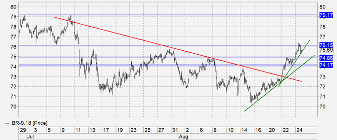 Покупка: при откате к 75.00 и 74.20. Стоп: 73.70. Цель: 85.00. Кто в позиции, перенести стоп на 73.70. Цель: 85.00.