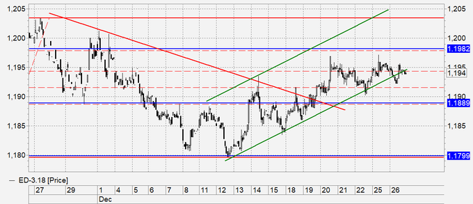 Евро: котировки стабилизировались в районе 1.1950 не в силах пробиться наверх. Картинка все больше заманивает нас в шорт, но не стоит делать что-то неочевидное когда уже все мысли о фужерах и салатах, так – как в случае роста до 1.2000 неопределенность сохранится, а вот в случае падения к 1.1900 рынок развернется вниз. Накануне праздника скорее всего будет разыгран сценарий при котором определенность не будет достигнута. Таким образом, почти интуитивно, ставим на рывок к 1.2000, так как среднесрочно он ничего в распределении сил не изменит.