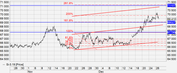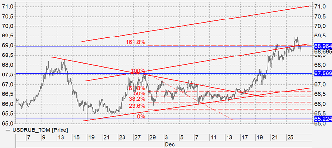 Рубль: взяли и показали вчера новый локальный максимум на 69.4850. Что это было? Скорее всего эмоции и нежелание оставаться на праздники в рублях. Излишки были переведены в валюту по любой цене. Если у вас все на счету в национальной валюте, то, конечно, вы нервничаете. Новых позиций не открываем.