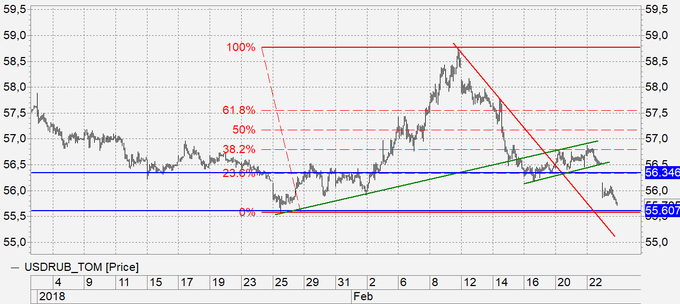 Рубль: а мы вчера и не сомневались. Нефть растет, рейтинг растет, а значит, и рубль растет. Сегодня национальная валюта должна продолжить укрепление. Падение ниже 55.50 должно привести к быстрому сбросу на 55.00.