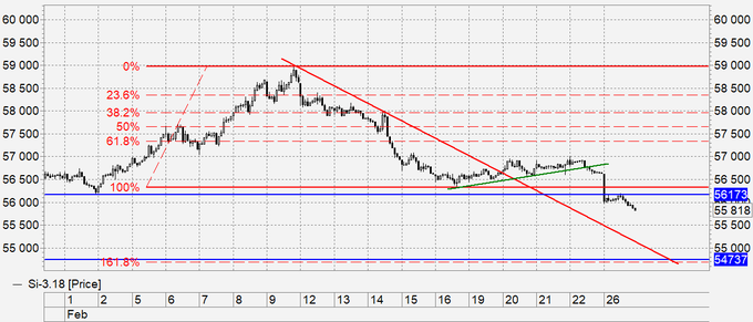 Продажа: при касании 56000. Стоп: 56600. Цель: 50000.