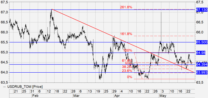 Рубль: пока все предсказуемо. Мы продолжаем толкаться в узком диапазоне 64.00 – 65.00 в преддверии лета. Создается стойкое ощущение, что в последнее время число внутренних проблем в США и ЕС начинает отвлекать все больше ресурсов этих локомотивов потребления на решение текущих задач, что автоматически означает склонность к переговорам, а не ультиматумам, а также перекосы в бюджетах, так как на все денег никогда не хватало, не хватает и хватать не будет. Вряд ли рубль поднимется выше 65.00 в текущей относительно миролюбивой ситуации.